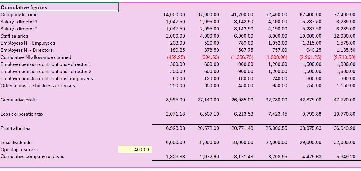 The calculator lets you track your cumulative company reserves. The calculator estimates the tax liability and national insurance for two directors and includes the option to claim the Employer’s National Insurance Allowance of £10,500 if your company is eligible. Director NI calculations assume an NI letter of A.