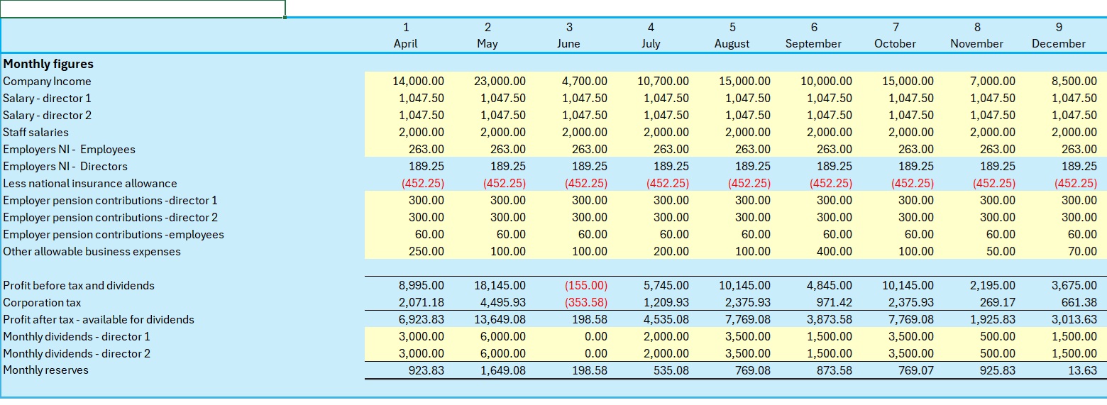 Our Limited Company Director Tax Calculator Excel Spreadsheet is designed for up to two self-employed individuals who are company directors, working through a limited company. Estimate your company and personal tax liabilities on a monthly and cumulative basis, helping you stay on top of your finances. Enter the directors’ salaries, company pension contributions, employee costs, business income and allowable business expenses to estimate the company’s corporation tax liability, employer and employee national insurance contributions, personal tax (PAYE), and dividend tax.