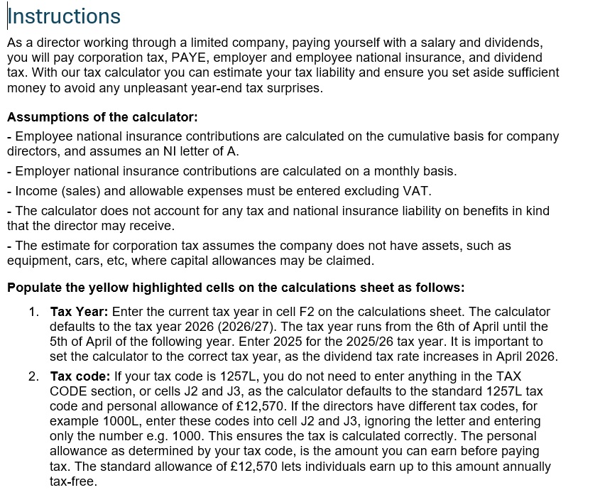 The calculator is not suitable for companies with fixed assets where tax allowances form part of the corporation tax calculation. The calculator can be used just to calculate the director’s tax liabilities (PAYE, national insurance and dividend tax), excluding any business tax. The calculator is not suitable for Scottish taxpayers.