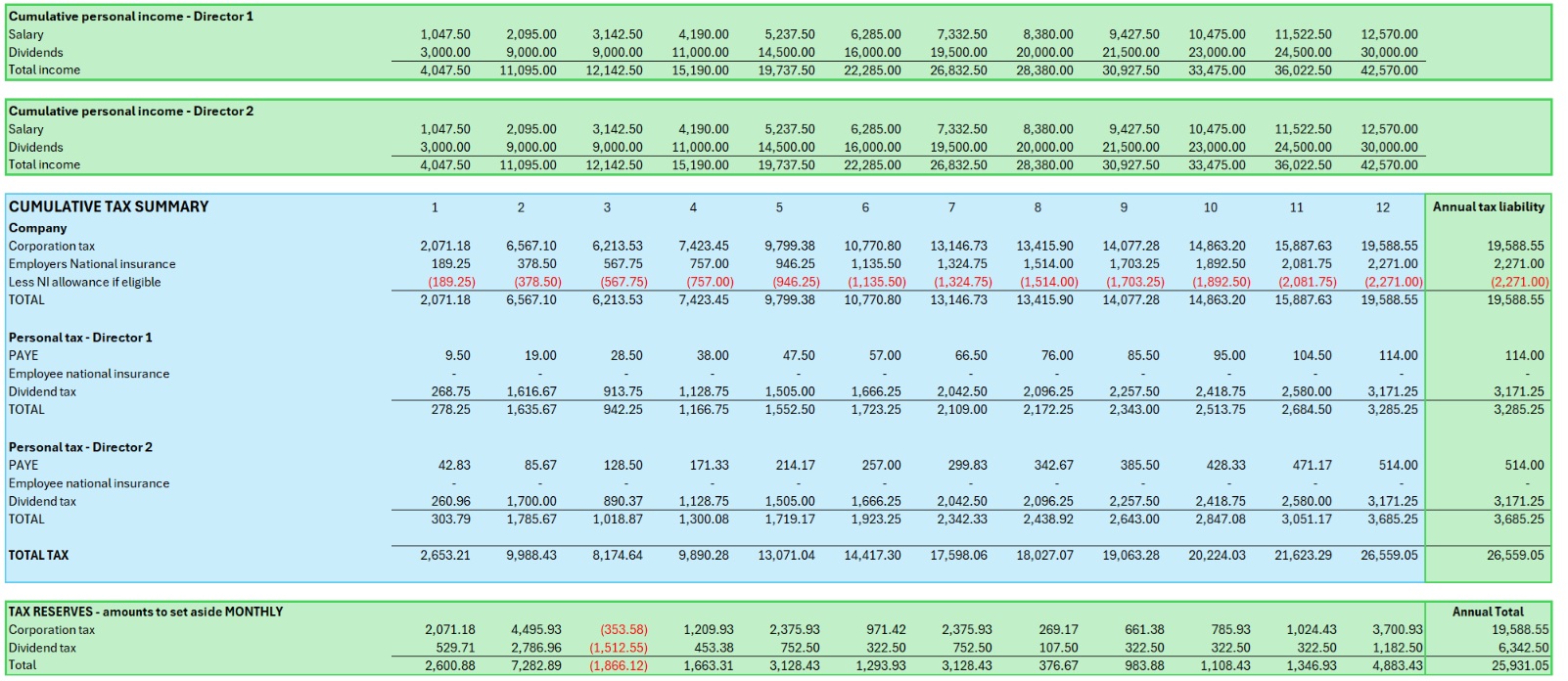 The spreadsheet includes a section that estimates the cash to set aside as reserves to cover the annual corporation tax and dividend tax liabilities.